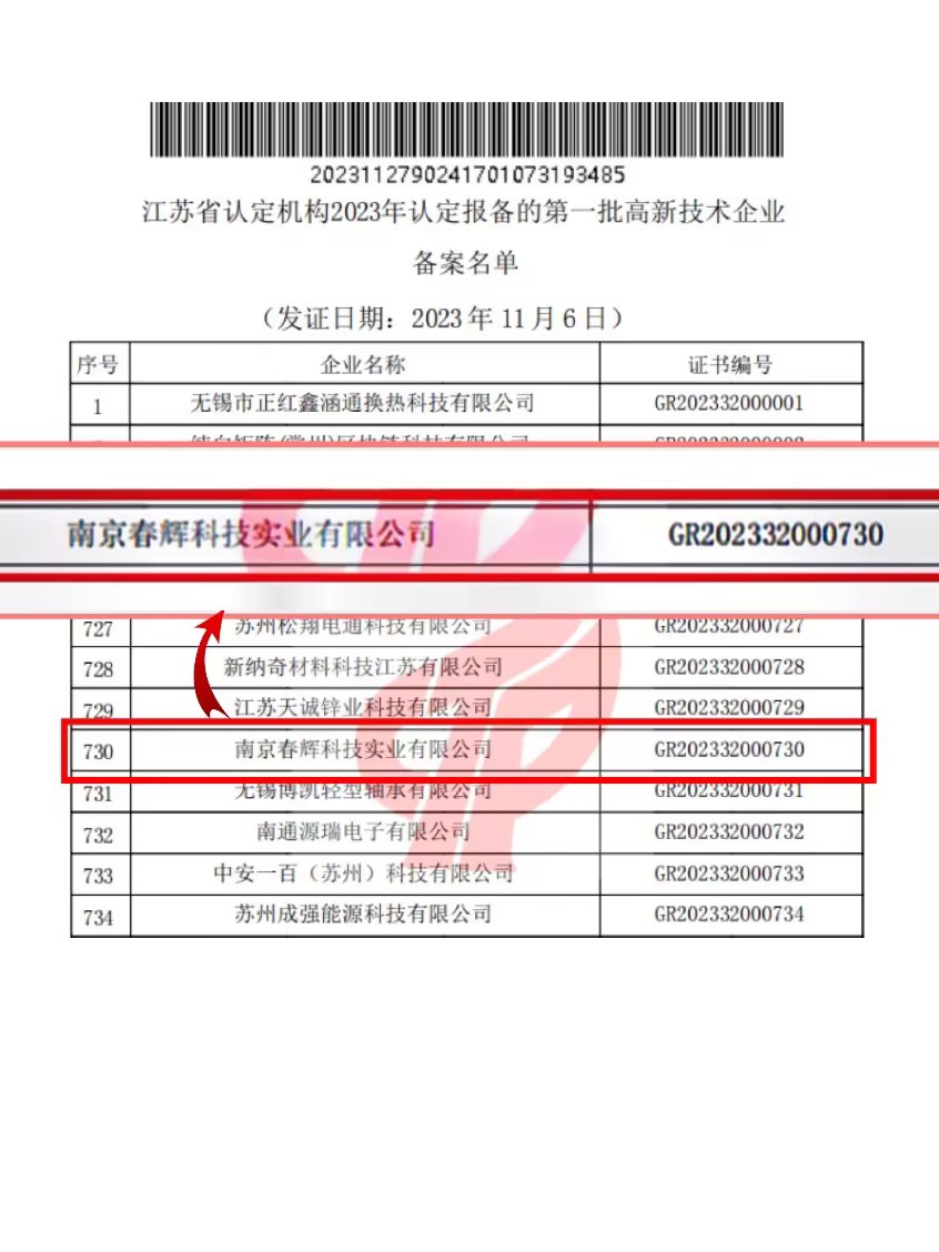 11月27日,根據(jù)《高新技術(shù)企業(yè)認(rèn)定管理辦法》和《高新技術(shù)企業(yè)認(rèn)定管理工作指引》有關(guān)規(guī)定,全國高新技術(shù)企業(yè)認(rèn)定管理工作領(lǐng)導(dǎo)小組辦公室發(fā)布了江蘇省認(rèn)定機(jī)構(gòu)2023年認(rèn)定報備的第一批高新技術(shù)企業(yè)名單,春輝公司順利通過復(fù)審認(rèn)定,再次被授予國家高新技術(shù)企業(yè)稱號。